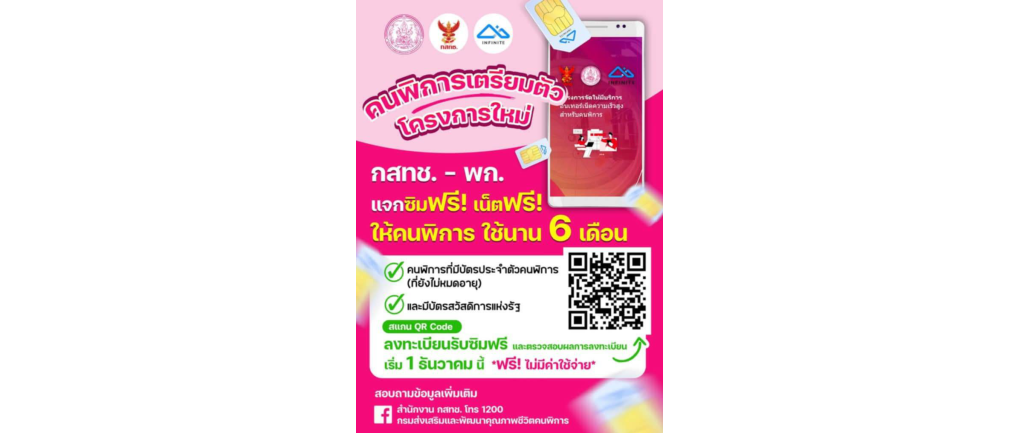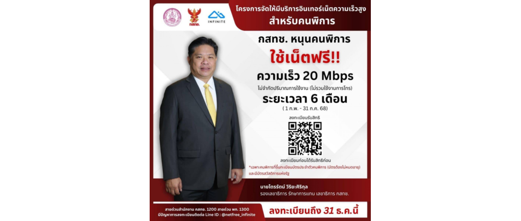 โครงการจัดให้มีบริการอินเทอร์เน็ตความเร็วสูงสำหรับคนพิการ สำนักงาน กสทช. ร่วมกับ กรมส่งเสริมและพัฒนาคุณภาพชีวิตคนพิการ เพื่อให้คนพิการที่ยากจน เข้าถึงอินเทอร์เน็ต สามารถใช้งานเน็ต ไม่จำกัดปริมาณความเร็ว เน็ตไม่ต่ำกว่า 20 Mbps ฟรี (ไม่รวมใช้งานการโทร)